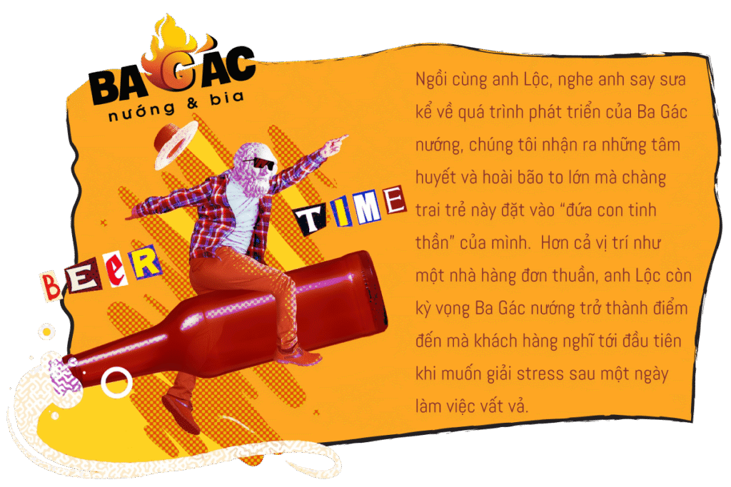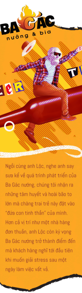nPhần đông khách hàng tìm đến Ba Gác nướng - chuỗi bia vườn nổi tiếng nhất nhì Sài thành - có lẽ cũng vì lý do ấy. Ba Gác nướng có bia tươi, có món nhắm ngon để lai rai, có trải nghiệm “đậm chất Việt” giao thoa giữa ẩm thực, không gian và nghệ thuật. Vậy nên người ta mới nói, đến Ba Gác nướng là để gác ba điều: Gác âu lo, Gác muộn phiền, Gác vai nhau chia sẻ niềm vui. Đó cũng chính là “kim chỉ nam” mà Co-founder của Ba Gác nướng - anh Lộc - đặt ra cùng với các cộng sự từ ngày đặt những viên gạch đầu tiên cho Ba Gác nướng.