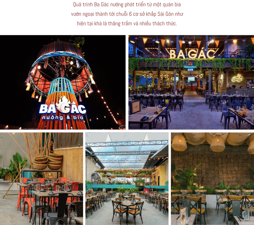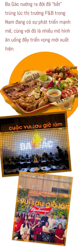 nGiai đoạn đó thị trường F&B trong Nam đang đi lên mạnh mẽ, các khu vực ngoại thành như Hóc Môn ngày càng phát triển hơn. Trùng hợp hơn nữa là mô hình bia vườn (bia garden) cũng vừa chớm nở, mới có vài người thử; nhưng cá nhân anh thấy nó đơn giản, dễ làm và sẽ có triển vọng hút khách rất lớn trong tương lai. Vậy nên sau khi bàn bạc nghiên cứu kỹ lưỡng, anh quyết định chọn mô hình này và mở quán Ba Gác nướng đầu tiên ở Hóc Môn.