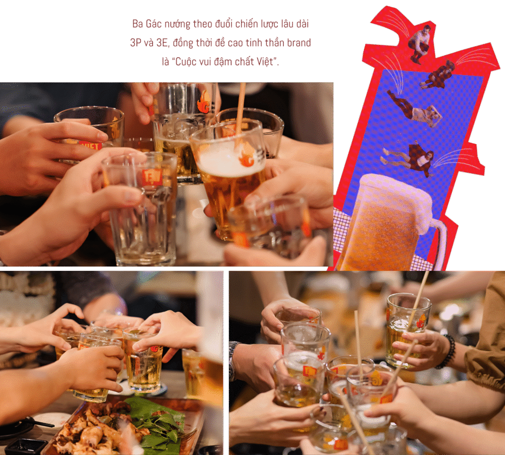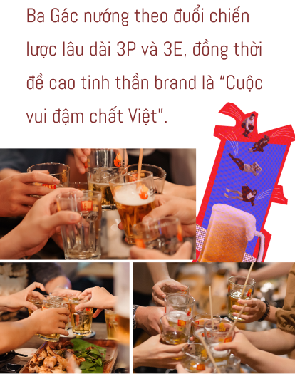 Chữ P tiếp theo là Product. Menu của Ba Gác nướng hiện nay khá là ổn - theo đánh giá khách quan của một người hay đi nhậu là anh (cười). Ở mỗi cơ sở, menu sẽ có sự matching nhất định với concept của cơ sở đó, làm sao để ra được cái “đậm chất Việt” rõ nét nhất. Chữ P cuối cùng là Performance, liên quan đến những yếu tố khác tạo thành trải nghiệm cho khách hàng ngoài đồ ăn. Mỗi cơ sở đều phải lưu ý khi lựa chọn âm nhạc, trò chơi, event,... làm sao mà vừa tạo được cái “mood” vui vẻ thoải mái cho khách, vừa đảm bảo vẫn đi theo tiêu chí “đậm chất Việt” của thương hiệu.