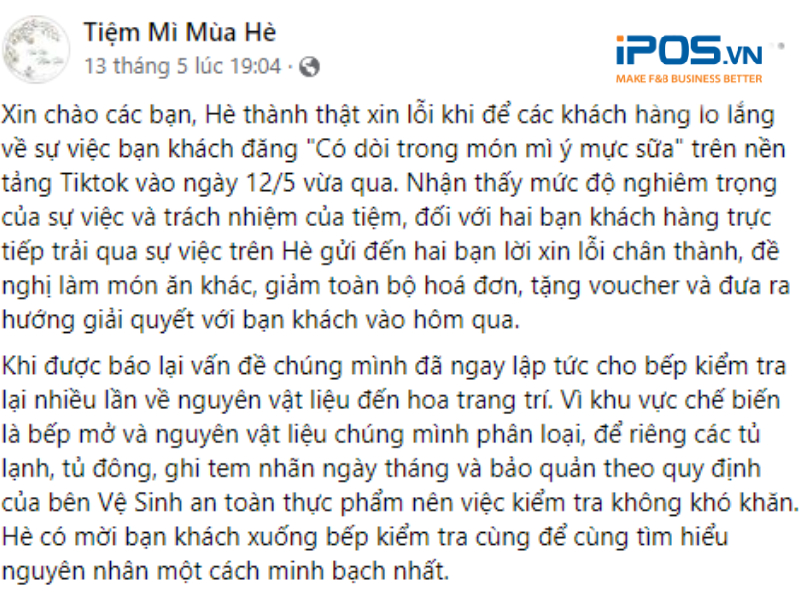 Tương tự, Tiệm Mì Mùa Hè cũng đã thẳng thắn nhận lỗi với khách hàng, khoanh vùng tìm ra nguyên nhân vì sao lại có dòi trong đĩa mỳ ý. Ngay khi biết là do ấu trùng ruồi xanh để lại, quán cũng nhanh chóng rà soát lại hệ thống bảo quản và khu vực chế biến, hợp tác với đơn vị chuyên xử lý công trùng để lắp đặt các thiết bị chống ruồi nhặng và thực hiện vệ sinh toàn bộ cửa hàng kỹ càng hơn. Thậm chí, Tiệm Mì Mùa Hè còn không giấu giếm mà sẵn sàng chạy quảng cáo cho 2 bài viết xin lỗi và khắc phục hậu quả trên Facebook, thể hiện đúng tinh thần cầu thị, dám nhận sai và đặt khách hàng lên trên hết.