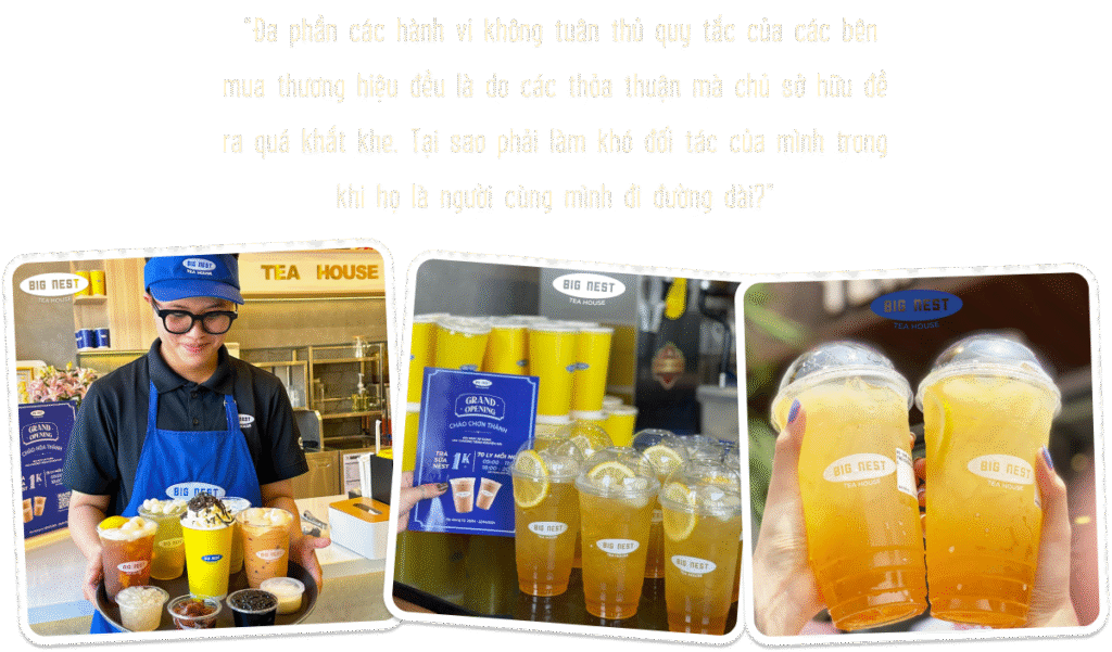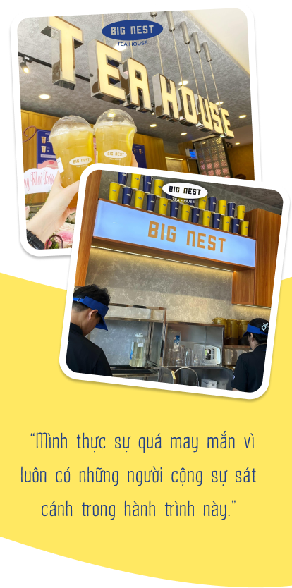 Để đảm bảo các cửa hàng luôn đáp ứng đầy đủ chất lượng, hàng tháng Big Nest sẽ có đội Kiểm soát chất lượng đi kiểm tra đánh giá từng điểm. Nếu đạt được điểm tiêu chuẩn, phía công ty sẽ tài trợ các gói giảm giá về nguyên vật liệu để khuyến khích họ. Big Nest cũng có cả bảng theo dõi “sức khỏe” kinh doanh của từng cửa hàng để đánh giá và đưa ra những giải pháp khắc phục cho các cửa hàng đang gặp vấn đề. “Trong trường hợp các đối tác gặp khó khăn thì chúng mình sẽ đồng hành, chia sẻ và đưa ra phương án hỗ trợ giải quyết cùng đối tác. Vì mục tiêu lớn nhất là mình muốn các đối tác phải đạt doanh thu tốt, ổn định, cùng chúng Big Nest phát triển, cùng nhau đi đường dài” - Mạnh chia sẻ.