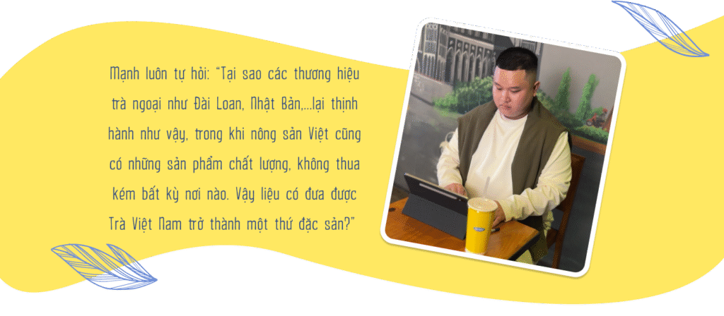 Từ niềm đam mê tới việc được đào tạo bài bản, Mạnh có định hướng nghề nghiệp rõ ràng. Năng lực chuyên môn và mạng lưới nghề nghiệp cần được phát triển hơn nữa, cậu  quyết định đầu tư thời gian, công sức chuyên sâu hơn về ngành trà. Mạnh xin làm ở 1 thương hiệu trà khá có tiếng ở Việt Nam thời đó, với mục tiêu được học thêm nhiều về trà: vị trà, nguồn gốc và những khu vực trồng trà khác nhau,...
