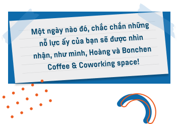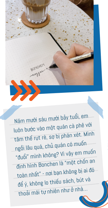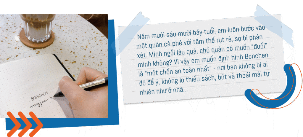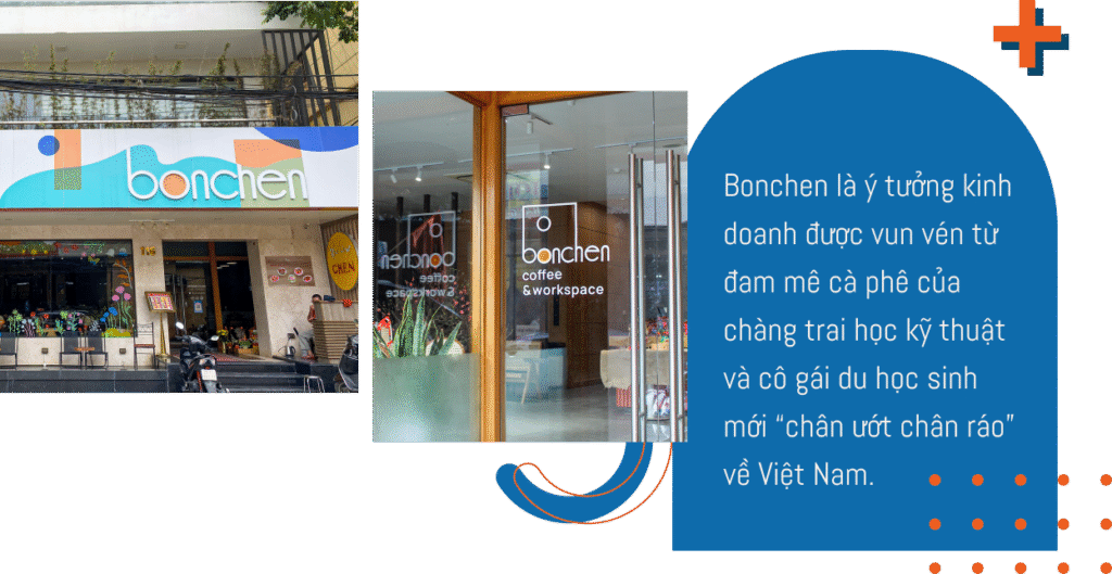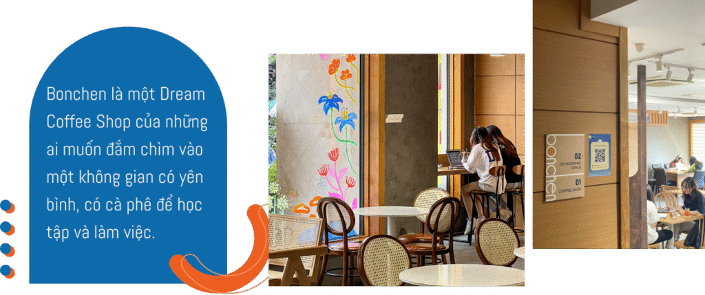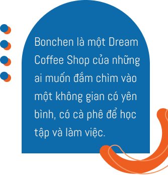 nMột điều nữa khiến em nung nấu ý định khởi nghiệp cà phê là: Sở hữu riêng cho mình một Dream Coffee Shop. Lý do bởi, em từng đi rất nhiều quán cà phê trong và ngoài nước, nhưng chưa có một nơi nào thực sự đáp ứng đủ các nhu cầu của em về thức uống, không gian và trải nghiệm dịch vụ. Bonchen là Dream Coffee Shop của em, nhưng sẽ là chốn thân thuộc của mọi người - những ai đang tìm kiếm một nơi yên bình để thưởng thức cà phê rồi chìm đắm vào học tập và công việc.