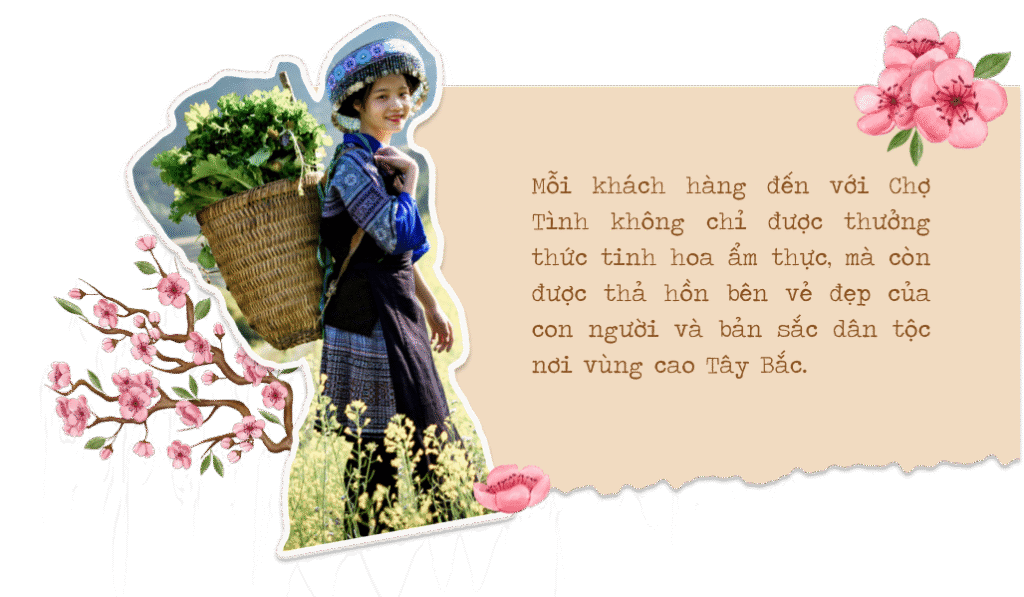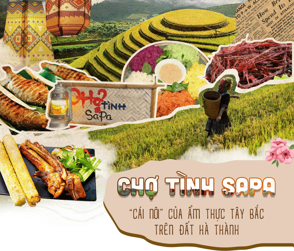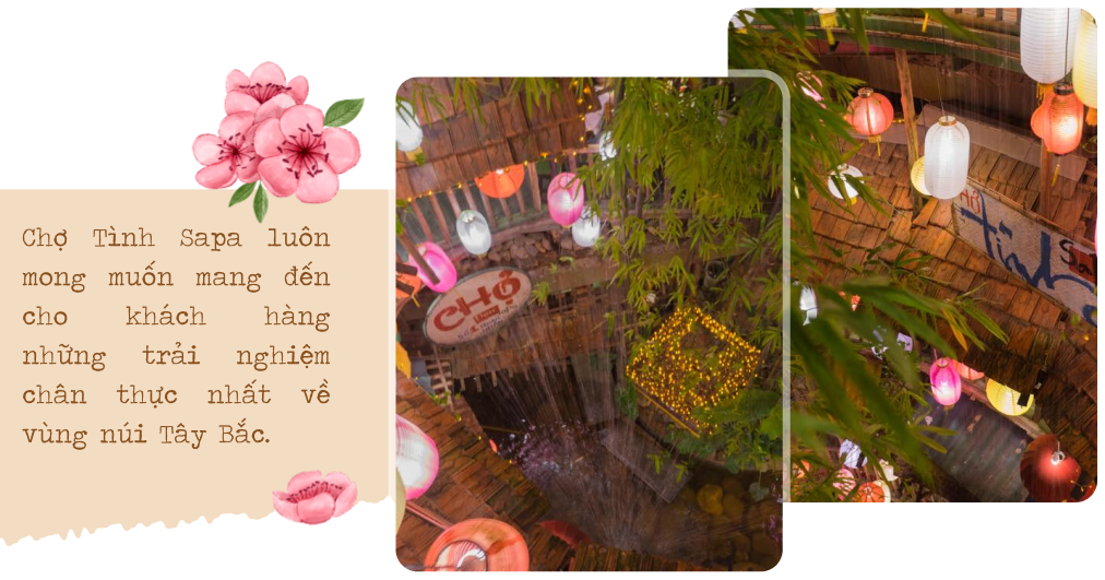 nĐặc biệt, ngay tại trung tâm của Sapa có một khu vực được gọi là khu Chợ tình. Chợ tình Sapa được coi là một nét đẹp văn hóa độc đáo, thu hút được rất nhiều du khách thăm thú và trải nghiệm. Nơi đây thường diễn ra nhiều hoạt động văn hóa của các dân tộc và là lễ hội truyền thống đặc sắc của các bản làng, thể hiện bản sắc dân tộc vùng cao nổi tiếng của Tây Bắc. Khu Chợ tình Sapa thực sự rất đẹp và cực kỳ thơ mộng, có nhiều điều thú vị để khám phá và để lại nhiều kỷ niệm cho những chuyến hành trình trải nghiệm của bọn anh. Vì thế, bọn anh càng mong muốn đưa ẩm thực Tây Bắc và khu Chợ tình Sapa về với thủ đô Hà Nội. Anh mong muốn những con người ở trên mảnh đất Hà Nội, những con người miền xuôi cảm nhận được nét đẹp, tinh hoa ẩm thực cũng như văn hóa của đồng bào vùng Tây Bắc.n