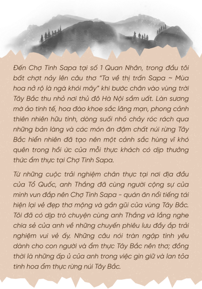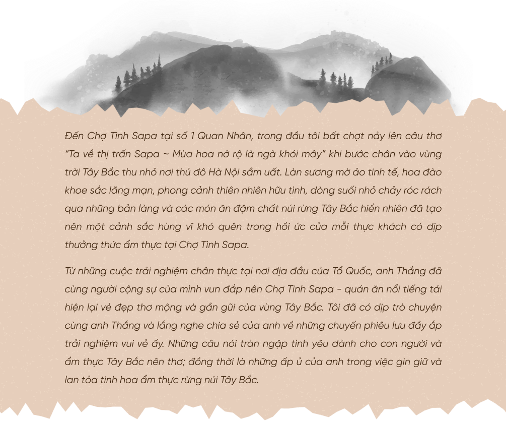 nAnh đã được trải nghiệm và hiểu thêm văn hóa của người dân Tây Bắc, được thưởng thức vô vàn món ăn đặc sản nổi tiếng. Những trải nghiệm chân thực như vừa ăn, vừa ở và sống như một người dân Tây Bắc đích thực đã thôi thúc anh cùng cộng sự lựa chọn tinh hoa của vùng Tây Bắc để bắt đầu ý tưởng kinh doanh quán ăn. Hơn thế, khi đến Sapa, con người cũng như các địa danh hùng vĩ tại vùng cao Tây Bắc rất đẹp, chính những điều này đã tạo cho bọn anh thêm nhiều cảm xúc và muốn đưa ẩm thực Tây Bắc về Hà Nội.n