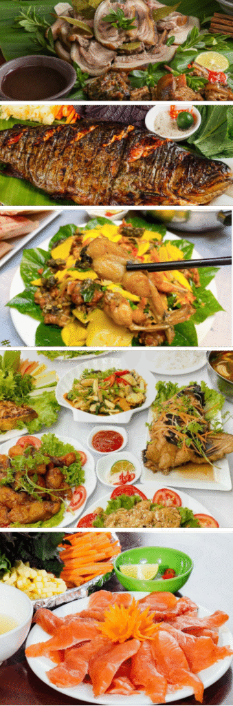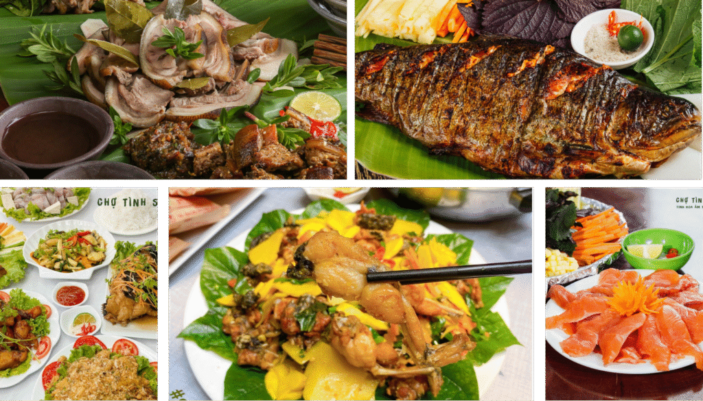 nVà điểm đặc biệt tiếp theo khiến thực khách luôn nhớ về Chợ Tình là menu phong phú và chất lượng từ món ăn cho đến đồ uống. Chợ Tình Sapa chủ yếu kinh doanh các món ăn đặc sản của vùng Tây Bắc, điển hình như Lẩu gà H’Mông, lẩu cá lăng Na Hang, lẩu cá tầm Sapa, set cá hồi Sapa, gà đồi, set lợn Mường Hòa Bình, Bê sữa Mộc Châu, trâu Sơn La và ti tỉ các món ăn được chế biến phong phú, đa dạng. Từng món ăn với cách chế biến khác nhau đều được chế biến tại các khu bếp riêng: khu sơ chế, khu nấu, khu bếp nướng,... Chợ Tình Sapa luôn đặt chất lượng món ăn lên hàng đầu, kể cả khi kinh doanh online cũng phải đảm bảo món ăn giữ được hương vị tươi ngon nhất khi đến tận tay khách hàng. Đồ ăn chỉ được phục vụ trong ngày để đảm bảo chất lượng được tươi ngon. Ngoài ra, các loại rượu đặc trưng nhất của vùng Tây Bắc hầu hết đều xuất hiện trong menu của quán: rượu táo mèo, rượu mơ, chuối hột… Đặc biệt, Chợ Tình chủ trương tự ngâm rượu thay vì nhập sẵn để bán cho khách.