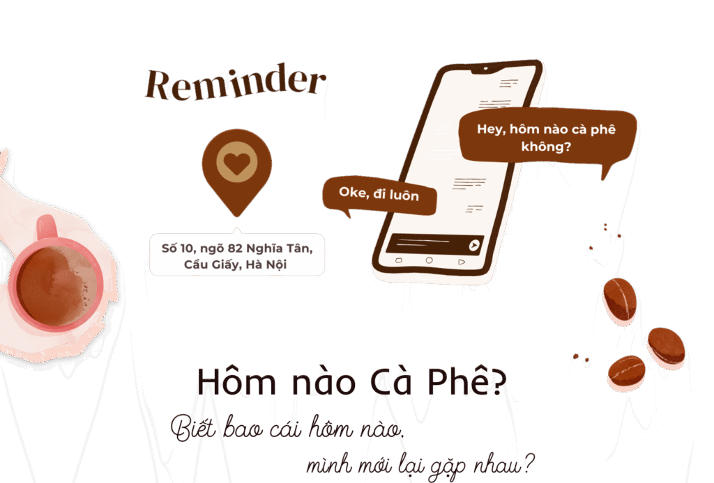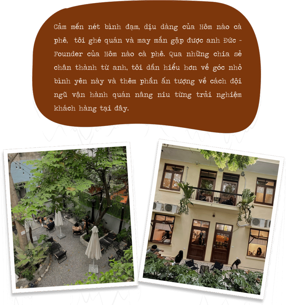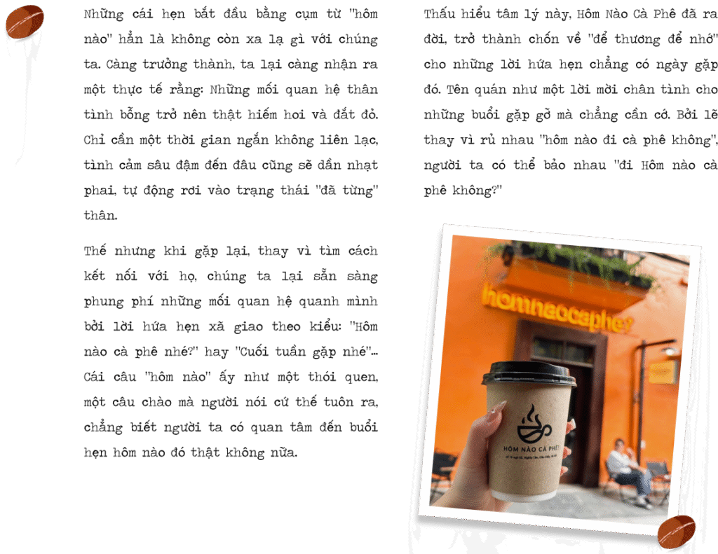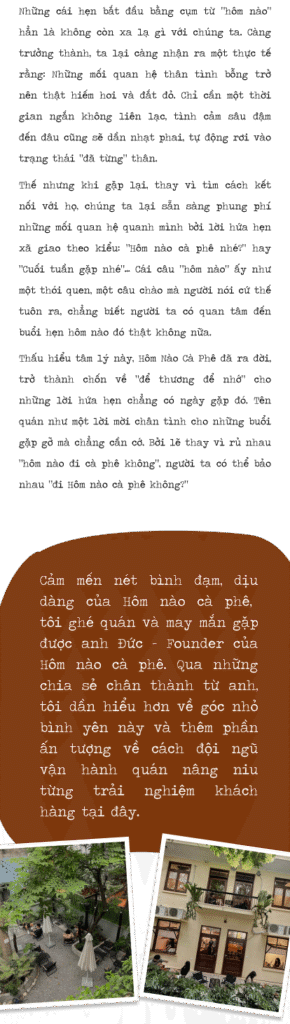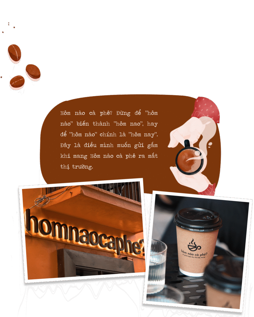 Hơn nữa, khi ấp ủ ý tưởng mở quán tiếp theo, mục đích của mình là tạo ra một thương hiệu gần gũi, đánh trực tiếp vào đời sống hàng ngày và được nhắc tới thường xuyên, dễ nhớ, dễ gọi. Nên thay vì sáng tác ra những câu chuyện phải dẫn dắt rất xa thì người nghe mới nhớ được tên, mình chọn một câu hỏi quen thuộc thường ngày giữa bạn bè với nhau, rằng hôm nào cà phê không?