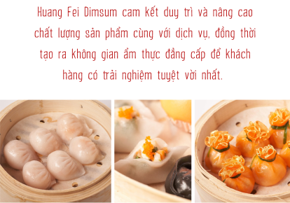 Để dung hòa sự khác biệt giữa hai nền ẩm thực, chúng tôi đã tìm hiểu kỹ lưỡng trên nhiều nền tảng công thức khác nhau để tạo ra món ăn đậm đà bản sắc “Huang Fei Dimsum”. Công thức đã được tinh chỉnh từ cái cốt lõi để đáp ứng khẩu vị chung của người Việt, nhưng vẫn giữ được những điểm đặc trưng độc đáo của ẩm thực Trung Hoa.