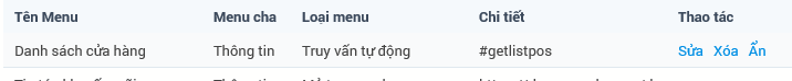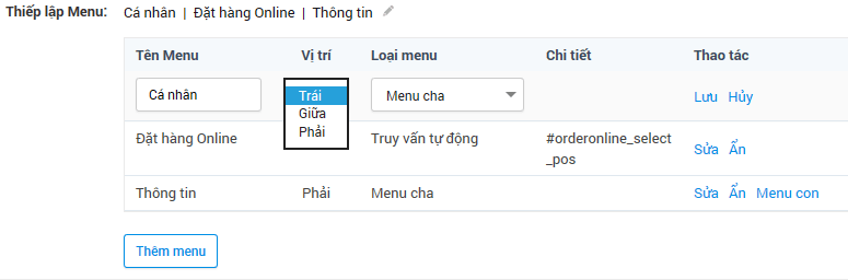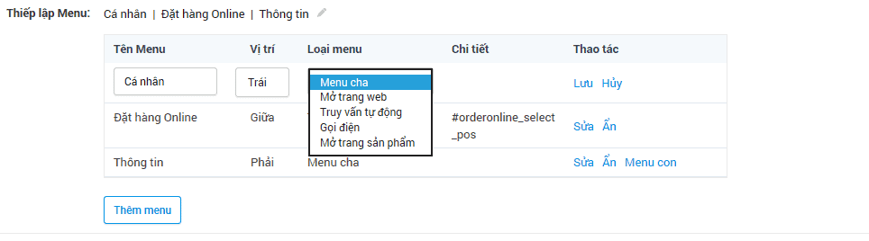 Bước 4: Chọn menu con > Thêm menu con > Nhập tên menu > Chọn loại menu > Nhập chi tiết phù hợp > Ấn Lưu