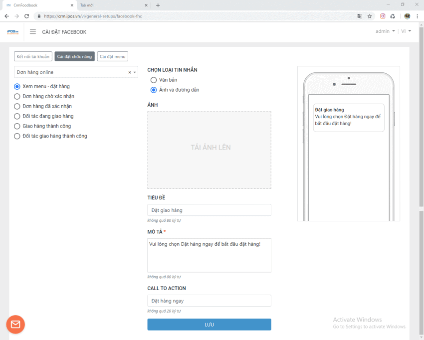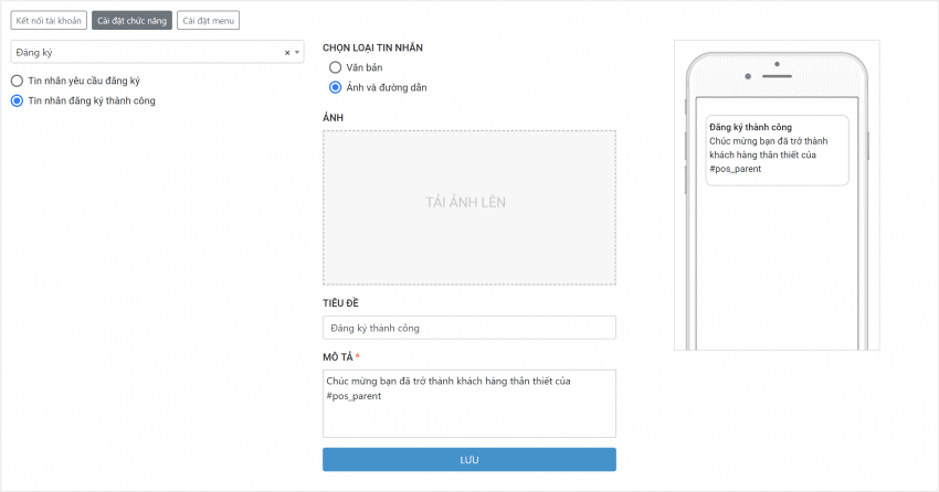 Bước 3: Chọn Tin nhắn đăng kí thành công > Chọn loại tin nhắn Ảnh và đường dẫn > Thêm ảnh, sửa Tiêu đề, Mô tả > Lưu