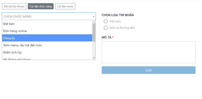 Bước 2: Chọn chức năng Đăng ký > Chọn Tin nhắn yêu cầu đăng kí > Chọn loại tin nhắn Ảnh và đường dẫn > Thêm ảnh, sửa Tiêu đề, Mô tả > Lưu