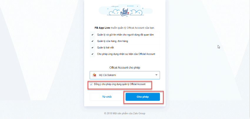 Bước 2: Ấn Kết nối OA Zalo > Tự động mở popup cấp quyền cho FB App Live > chọn OA Zalo cần kết nối > chọn “Đồng ý cho phép ứng dụng quản lý Official Account” > Ấn Cho phép