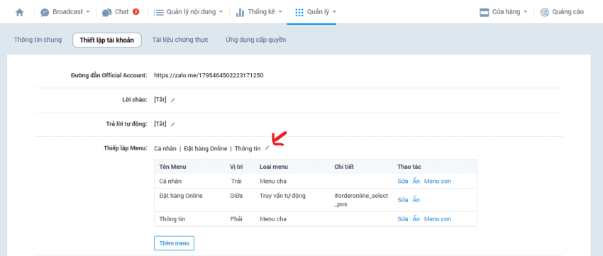 Bước 2: Chính sửa mục Thiết lập menu