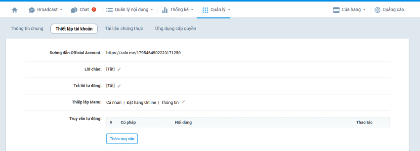 Bước 1: Truy cập OA Zalo > Quản lý > Thông tin tài khoản > Thiết lập tài khoản