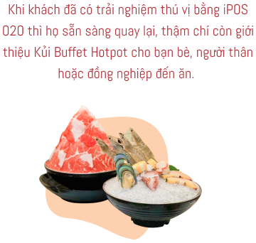 Kủi Buffet Hotpot là một trong những trường hợp tiêu biểu nhất đã ứng dụng giải pháp công nghệ như iPOS O2O trong quy trình vận hành để nâng cao trải nghiệm khách hàng. Thành công này là minh chứng rõ ràng cho việc các nhà hàng, quán cà phê thời 4.0 nên từng bước chuyển mình, xây dựng chiến lược lấy khách hàng làm trung tâm để có thể bứt phá, tìm lối đi riêng trên thị trường F&B hiện nay.