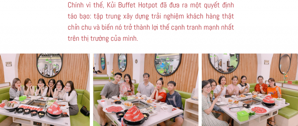 Tuy rằng đã tìm ra được “key” trong chiến lược cạnh tranh của nhà hàng, có điều nói thì dễ, bắt tay vào làm mới khó. Từ các case thành công của những “bậc thầy” chiều khách như Haidilao, Manwah, Meat Plus,... vợ chồng chị Hạnh cũng áp dụng vào với chính Kủi Buffet Hotpot: tặng dây buộc tóc cho khách, đánh giày miễn phí, ưu đãi cho các nhóm khách đi đông, tặng thêm món ăn ngẫu nhiên, chơi minigame tặng voucher,...