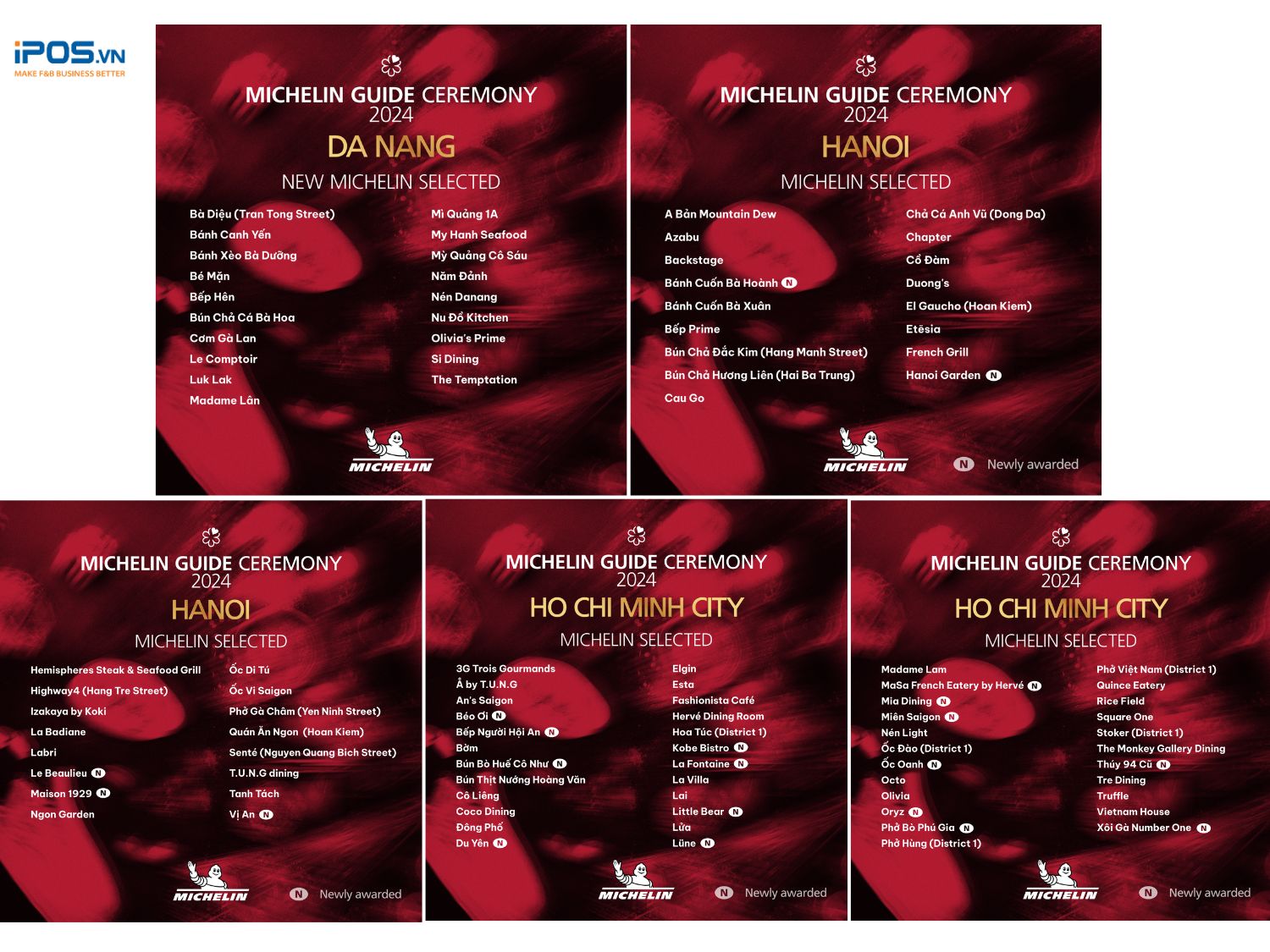 - Hạng mục MICHELIN Selected (danh sách nhà hàng được MICHELIN đề xuất) 99 cơ sở (trong đó: Hà Nội 33 cơ sở, Đà Nẵng 19 cơ sở, TP.HCM 47 cơ sở)