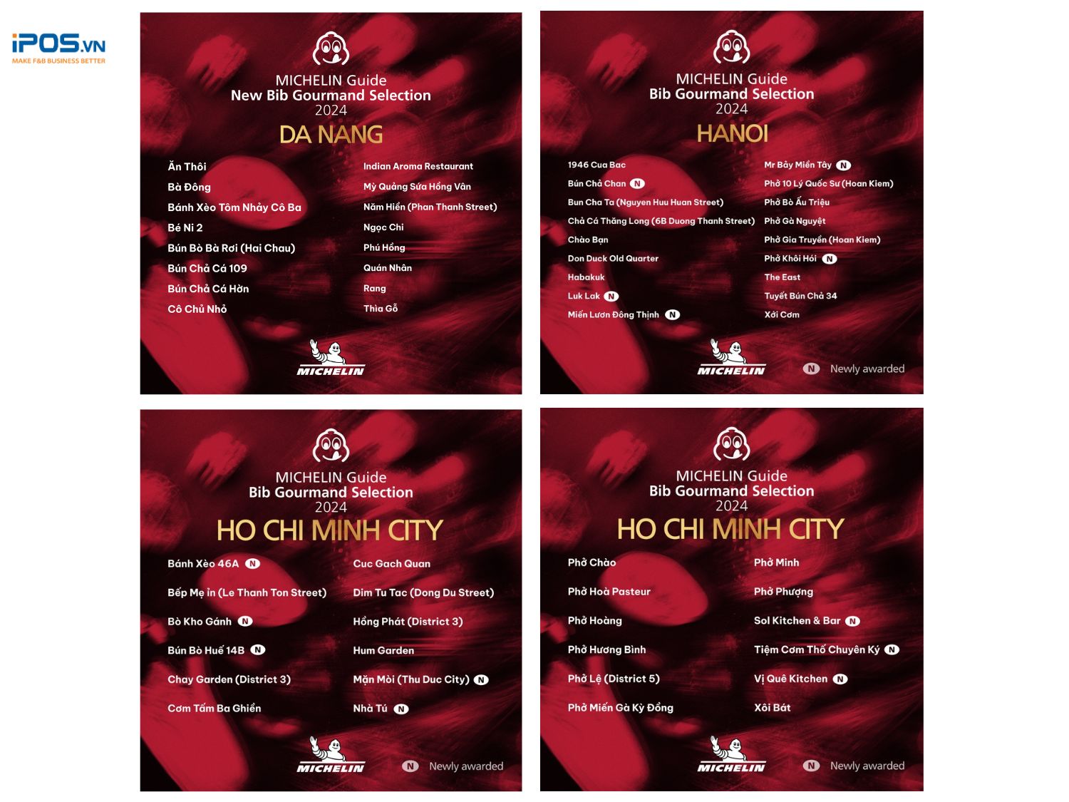 - Hạng mục Bib Gourmand (danh sách quán ăn ngon với giá cả phải chăng): 58 cơ sở (trong đó: Hà Nội 18 cơ sở, Đà Nẵng 16 cơ sở, TP.HCM 24 cơ sở)