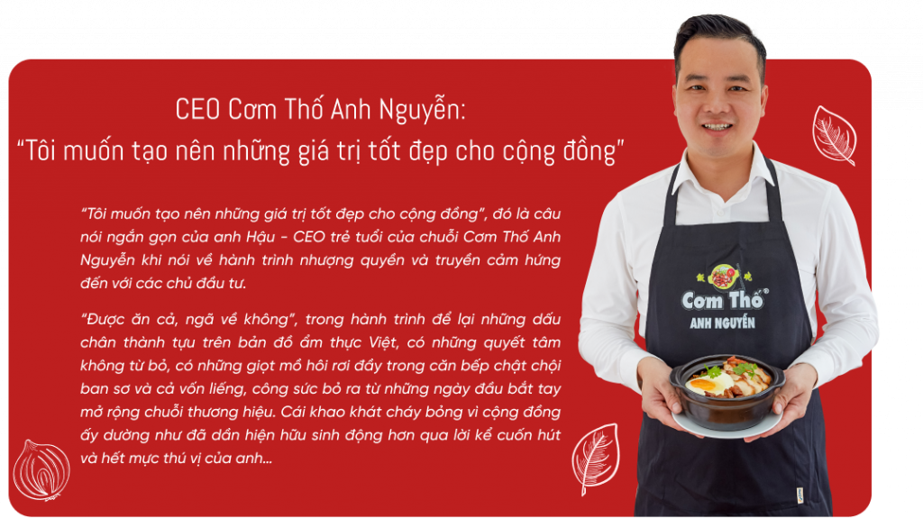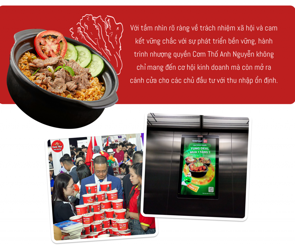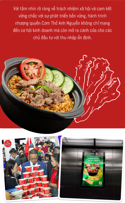 Với tầm nhìn rõ ràng về trách nhiệm xã hội và cam kết vững chắc với sự phát triển bền vững, hành trình nhượng quyền Cơm Thố Anh Nguyễn mang đến cơ hội kinh doanh và tự làm chủ cho các chủ đầu tư với thu nhập ổn định. Bằng cách cung cấp mô hình kinh doanh tối ưu hiệu quả và hỗ trợ toàn diện, Cơm Thố Anh Nguyễn đã thành công mang tới công ăn việc làm cho các nhà đầu tư và lan tỏa những giá trị đích thực trong cộng đồng doanh nghiệp.