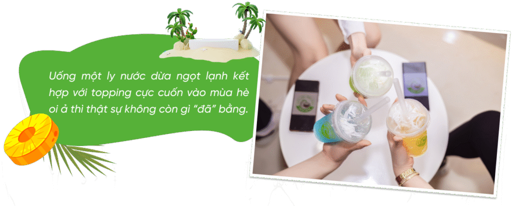 nCòn với dòng đồ uống Nước dừa trân châu thì hoàn toàn khác. Với 100% làm từ trái dừa tươi, giữ nguyên hương vị, dưỡng chất bên trong trái dừa. Được nghiên cứu sử dụng từ nguồn nguyên liệu qua tuyển chọn kỹ lưỡng, với nhiều topping đi kèm đặc sắc, thì khách hàng họ sẽ phải cân nhắc trước khi lựa chọn chứ. nVì thế thương hiệu chắc chắn sẽ là 1 “điểm sáng” của ngành đồ uống trong tương lai.