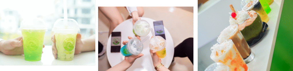 nCác món như: Nước dừa trân châu lá nếp, nước dừa trân châu tắc mật ong, sữa dừa đậu nành,... đều có nguyên liệu chính từ nước dừa, rất đặc biệt để khách hàng sử dụng, chứ họ không chỉ sử dụng nước dừa đơn thuần.