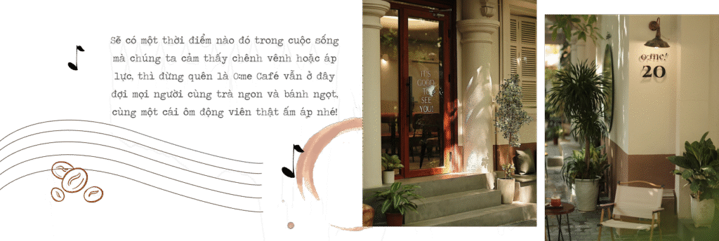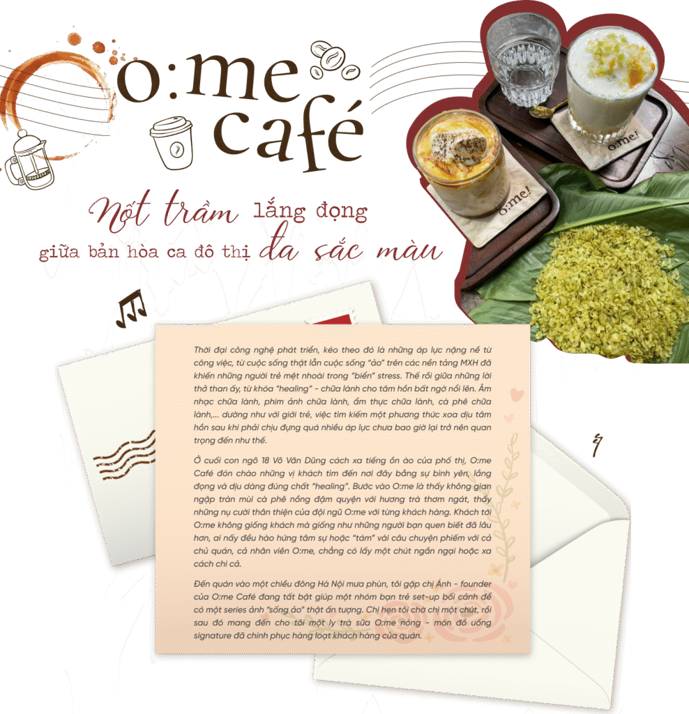 O:me Café nằm sâu trong một con ngõ yên tĩnh, đi theo concept nhẹ nhàng lãng mạn, lại mang cái tên với ý nghĩa “một cái ôm thật chặt” - tạo cảm giác O:me giống như một nơi thích hợp cho những ai đang tìm kiếm sự yên bình, thư giãn, chữa lành cho tâm hồn. Phải chăng đây cũng chính là ý định ban đầu khi chị sáng lập ra O:me Café?