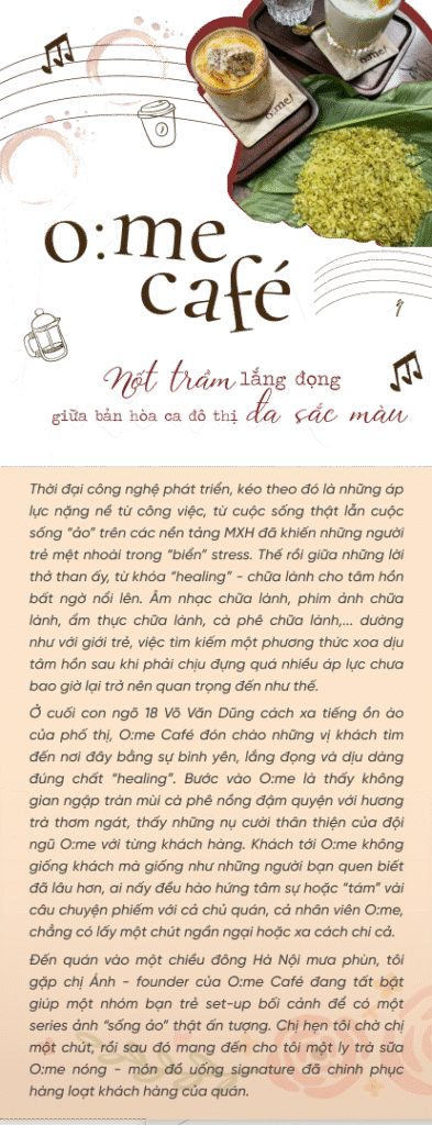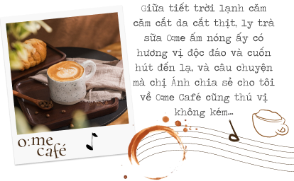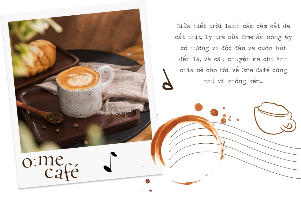 nTừ chính những mong muốn của cá nhân mình - mà chị nghĩ là cũng rất gần với tệp khách hàng mục tiêu nhắm tới của quán, chị đã bắt đầu định hình chiếc “khuôn” đầu tiên để làm nên O:me Café. Đối với chị, “đứa con tinh thần” O:me Café không chỉ là một nơi để mọi người đến “sống ảo”, check-in chụp ảnh hay thưởng thức đồ uống và bánh ngọt, mà O:me Café còn là một chốn trú ẩn, là nơi mà bất kỳ khách hàng nào cũng có thể cảm nhận được sự bình yên, thoải mái và có thể dành thời gian lắng nghe chính bản thân mình.
