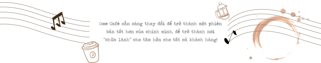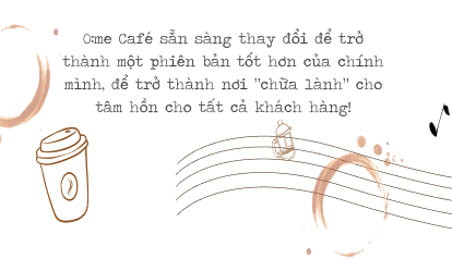 nCó thể ở thời điểm hiện tại O:me Café chưa thật sự quá hoàn hảo, cũng như vẫn còn có những thiếu sót cần khắc phục. Nhưng O:me Café luôn sẵn sàng đón nhận mọi lời góp ý dù là tiêu cực hay tích cực để thay đổi, cố gắng trở thành một phiên bản tốt hơn của chính mình, và để tất cả các khách hàng tới nơi đây đều có thể cảm nhận được sự thoải mái, “chữa lành” trong tâm hồn!