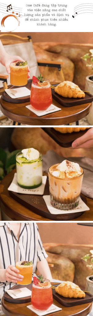 nTừ những kết luận đó, chị so sánh O:me Café với các quán trên để biết điểm giống và khác nhau, sau đó sẽ tìm cách để khắc phục những thiếu sót cũng như đẩy mạnh các ưu thế của quán. Đặc biệt, chị chú trọng nhất vào việc xây dựng quy trình vận hành tối ưu nhất có thể cho O:me Café, đảm bảo quán luôn hoạt động nhịp nhàng theo một luồng công việc ổn định, các khâu không bị rối loạn dù cho thiếu nhân sự hoặc không có quản lý giám sát.