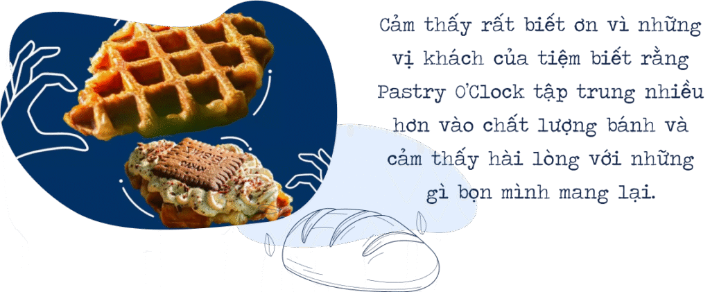 nPhải mất đến 1 năm cửa tiệm mới hoạt động ổn định, tuy nhiên bọn mình vẫn chưa hài lòng lắm. Chính vì vậy, Pastry O’Clock vẫn sẽ tiếp tục cố gắng và cải thiện quy trình để mang đến những loại bánh chất lượng nhất cho khách hàng thân thiết của tiệm.