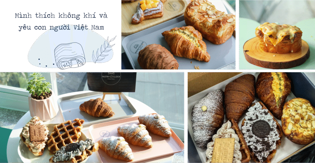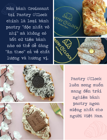nBọn mình tự hào rằng với công thức gốc và chất lượng làm bánh tại Pastry O’Clock có thể khiến cho bạn bè Việt Nam cảm thấy hài lòng. Và thật may mắn, giống như bọn mình đã kỳ vọng, phần lớn khách hàng Việt Nam đều dành sự yêu thích với món bánh Croissant tại Pastry O’Clock. Hiện tại, khách hàng đã có thể xem những phản hồi, đánh giá về tiệm trên các nền tảng mạng xã hội và ứng dụng đặt đồ ăn có mặt Pastry O’Clock như GrabFood, ShopeeFood, Facebook, Instagram.n