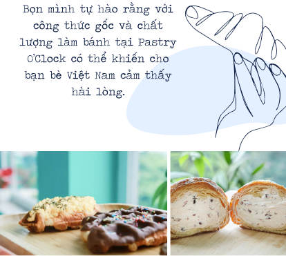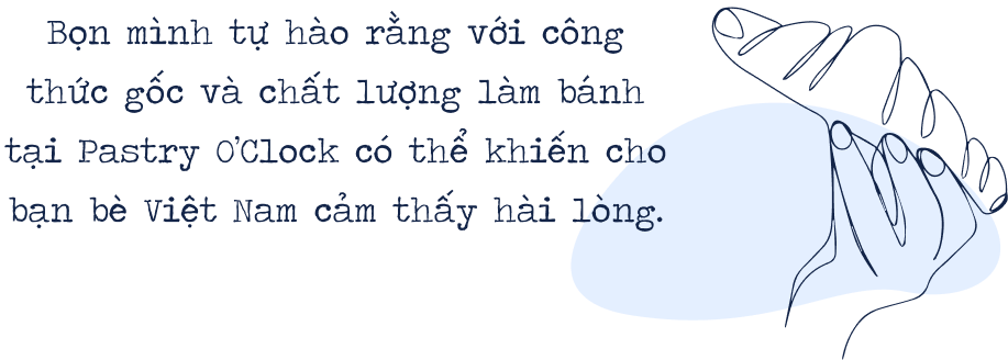 nHiện mình và một người bạn nữa đang cùng nhau điều hành tiệm bánh Pastry O'Clock. Trước khi sang Việt Nam, cậu ấy đã nhận được chứng chỉ “Pastry Master”. Trong việc điều hành tiệm bánh, hai bọn mình sẽ hỗ trợ lẫn nhau. Cậu ấy phụ trách làm bánh mỗi ngày và giữ cho chất lượng bánh trong trạng thái tốt nhất. Còn mình là quản lý chính của tiệm, đồng thời sẽ là “cầu nối” đem đến cho khách hàng trải nghiệm tuyệt vời với những món bánh pastry chỉ có tại Pastry O'Clock.n