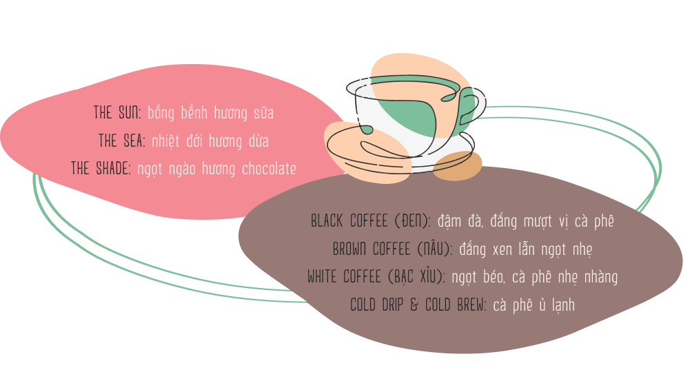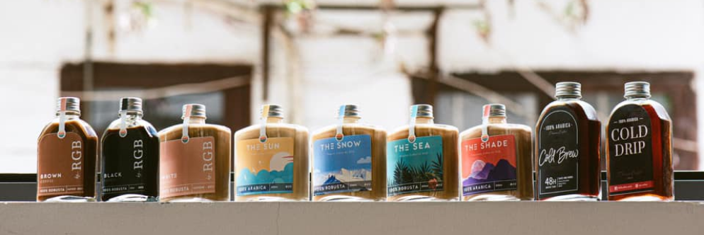 Tôi không nhớ rõ menu RGB Coffee có tất thảy bao nhiêu món đồ uống. Nhưng nếu có một ai bất chợt hỏi về cà phê nào “ổn áp”, tôi sẽ không ngần ngại mà giới thiệu họ ngay bộ sưu tập cà phê đóng chai của RGB Coffee. Có thể nói, đây là sản phẩm signature khiến người ta phải nhớ thương về quán. Bộ sưu tập bao gồm tám hương vị. Bộ ba truyền thống có Black, Brown, White và cà phê ủ lạnh. Còn bộ ba đặc biệt là The Sun, The Sea và The Shade. Để đảm bảo chất lượng cho sản phẩm, mỗi tuần RGB chỉ sản xuất 50 chai cà phê ủ lạnh. Công bằng mà nói, cả tám hương vị này là tám sắc thái khác nhau - không thể phân định đâu là vị cà phê ngon nhất.