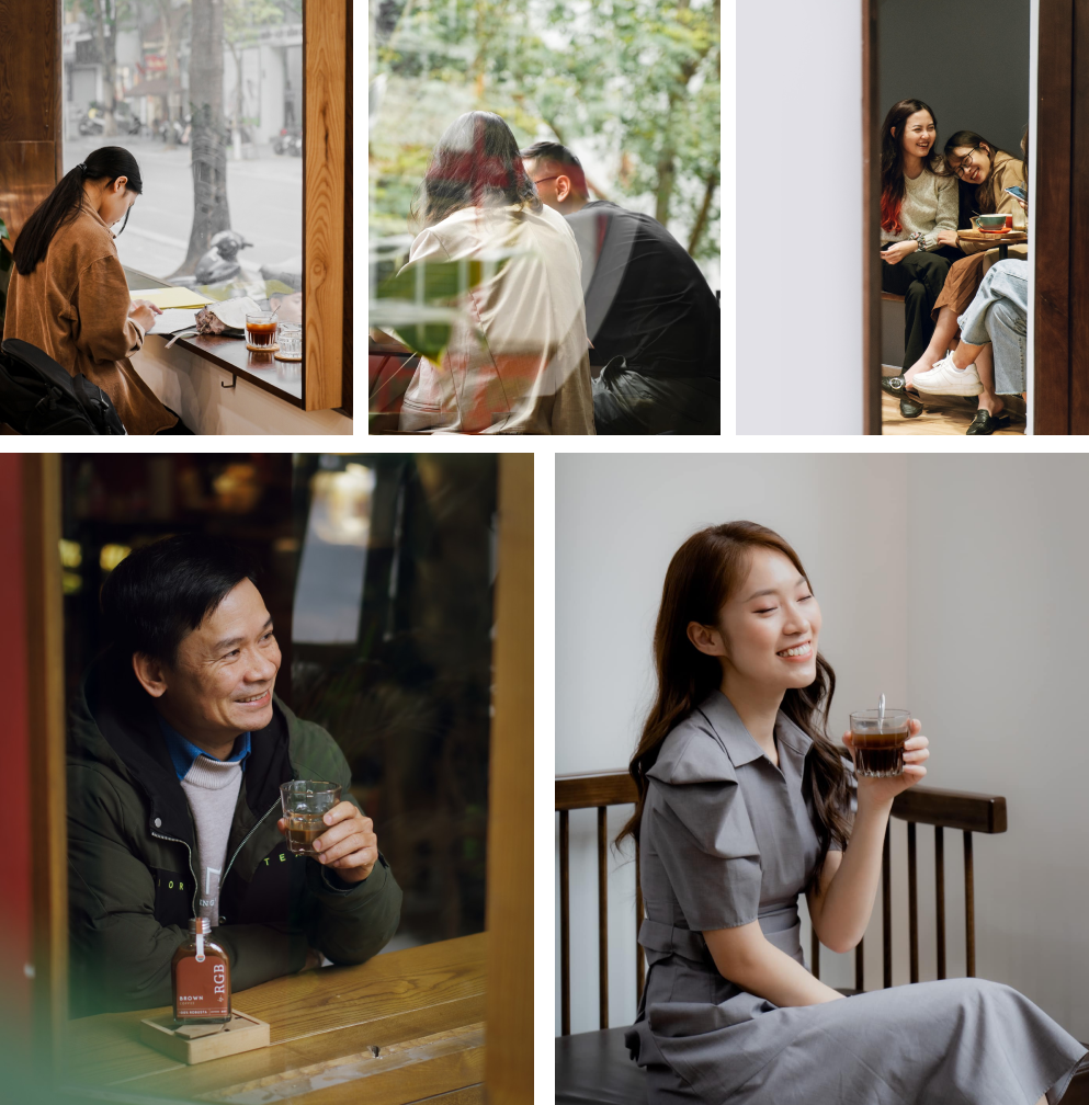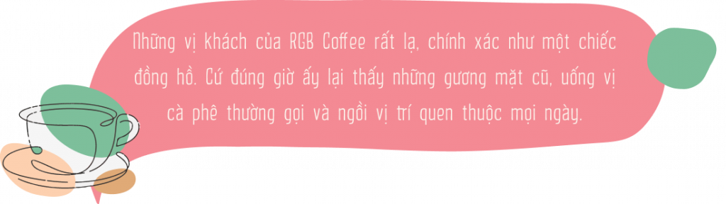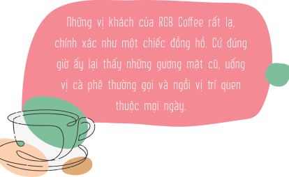 Lại kể về khách hàng thời nay của RGB Coffee, không chỉ là những bạn trẻ, sinh viên trẻ trung năng động, mà ngay cả dân công sở, ông chú trung niên cũng “nghiện” cái quán này. Có cụ già chừng đâu bảy chục tuổi, hôm nào cũng phải gọi một chai đen đá. Cứ tầm giờ ấy là ông lại ghé quán này, tay cầm chiếc Nokia cục gạch, khoác chiếc áo nâu đã cũ. Nhân viên nhìn thấy là biết ngay ông muốn gọi gì, và định ngồi ở góc nào.