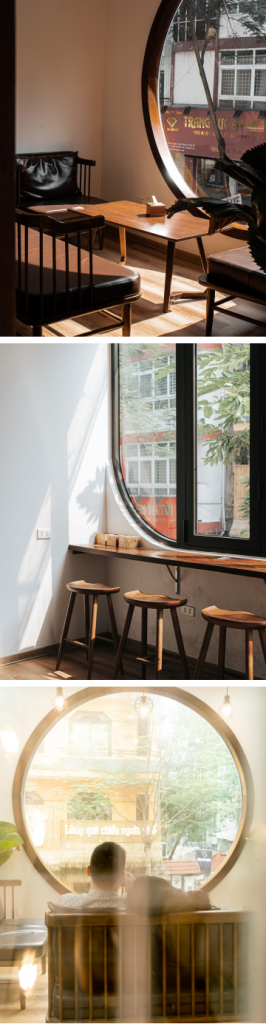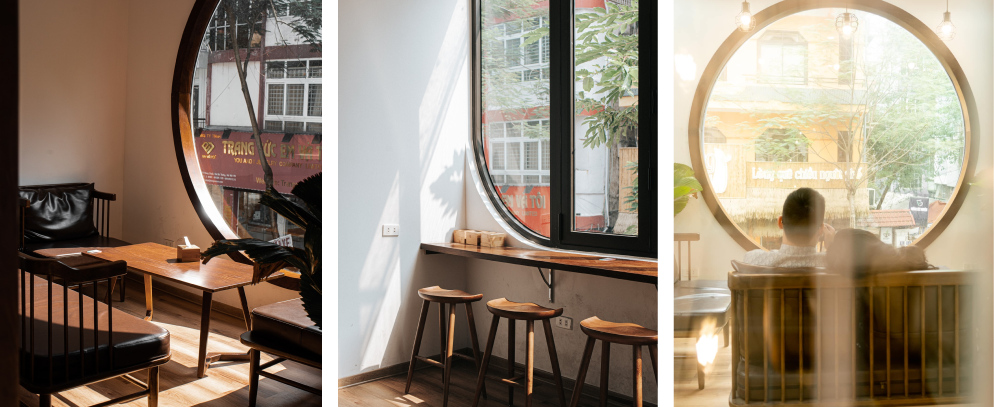 Tôi cứ thắc mắc không hiểu vì sao mà thiết kế hầu hết các cánh cửa ở đây là mang hình tròn hoặc hình vòm. Đặc biệt là ô cửa sổ gỗ tròn - biểu tượng của RGB Coffee, đẹp tựa thước phim Hàn Quốc. Có thể đó chỉ là cách điệu trong thiết kế, cũng có thể là nhận diện thương hiệu của RGB. Thế nhưng không bàn về chuyên môn, tôi thực sự cảm thấy “ưa mắt” khi nhìn vào những vòng tròn đó - một cảm giác nhẹ nhàng và thư thái đến lạ.