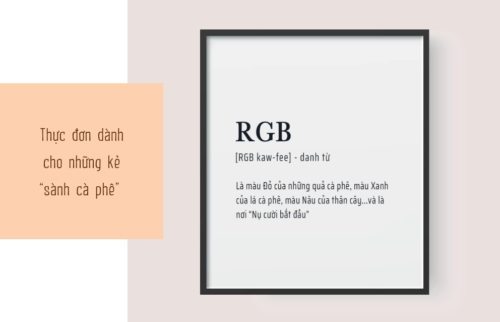 Cái tên RGB dễ làm người ta thường liên tưởng đến những gam màu thường dùng trong thiết kế, đồ họa. Thế nhưng ý nghĩa thực sự của RGB lại là thái cực màu sắc của một cây cà phê, viết tắt của Red, Green và Brown. Đúng là chỉ những ai thấm nhuần tình yêu với cà phê mới có thể nhận ra điều tinh tế này.