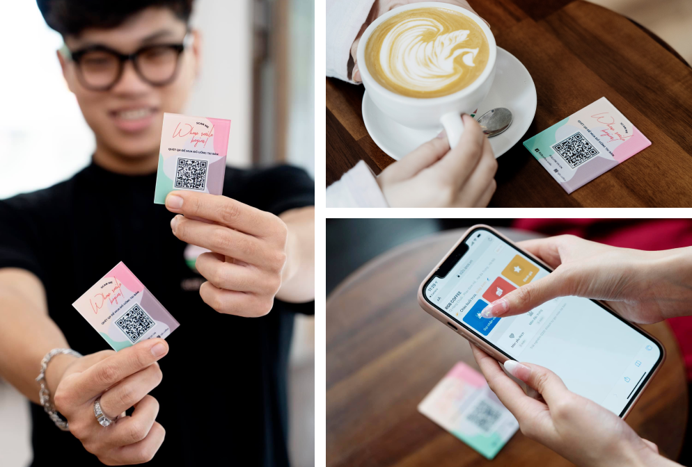 Một điểm ấn tượng về RGB Coffee mà tôi chưa thấy đâu có, đó là không hề có nhân viên phục vụ. Khách hàng tới đây có thể chọn đồ uống tại quầy thu ngân, hoặc quét mã QR được gắn trên mỗi bàn để order món trên điện thoại cá nhân. Thường thì lần đầu tới đây, ai cũng đều gọi món tại quầy. Nhưng chỉ cần đến lần thứ 2, thứ 3 là họ bắt đầu hứng thú với việc quét mã để đặt đồ, gọi thêm món, thêm giấy ăn ống hút, gọi nhân viên, đánh giá.... Trải nghiệm này vừa nhanh chóng thú vị, cũng vừa đỡ “phiền”. Vì nhiều người “sành cà phê” cũng lạ lắm, đi cà phê không phải đi gặp gỡ con người, mà để “ẩn mình” khỏi cái xô bồ của phố xá ngoài kia.
