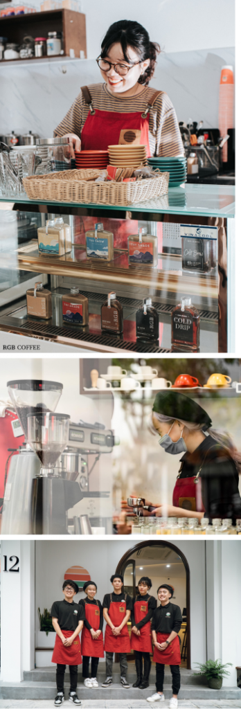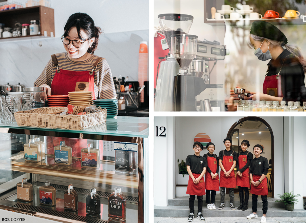 Dù tinh tế hay vụng về, bộ phận chăm sóc khách hàng tại RGB cũng đều đặt trải nghiệm của khách lên hàng đầu. Không chỉ bê nước, dạ thưa khi khách "em ơi, anh gọi…", họ còn trực tiếp là người trò chuyện, để ý và hỏi han khi khách cần. Ở đây có chàng trai nghịch ngợm, hay trêu tức người nhưng lại biết đặt ly sữa ấm trước bàn một bạn nữ vừa tiêm xong Covid, dặn “Đừng uống cà phê nhé!”. Hay có một cô bé sinh viên tinh ý, khách nào từng ghé, hay uống đồ nào, hay đi với ai, tâm trạng ra sao,.. đều nhớ đủ cả. Khách hàng và nhân viên quán vốn chẳng thân thích, nhưng vì cà phê ngon mà về đây tụ họp và trở thành “người quen” của nhau.
