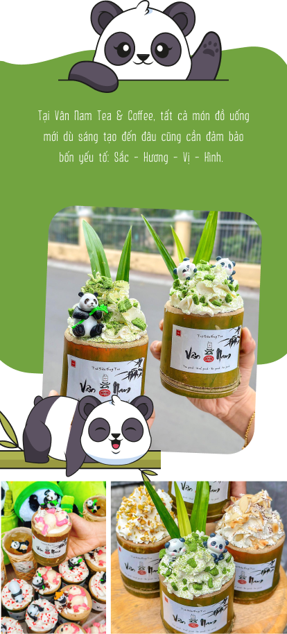 Trà sữa các vị khác nhau được đựng trong ly làm từ ống tre thật 100%, phủ lên trên một lớp kem trắng bồng bềnh, thêm một chú Thạch Gấu Panda Pink núng nính, dễ thương vừa đem đến trải nghiệm đồ uống thú vị, vừa tạo được những bức hình check-in độc lạ. Đặc biệt, ly ống tre mà Vân Nam sử dụng là sản phẩm thủ công do chính người nông dân Việt Nam làm ra. Mức độ tiêu thụ càng nhiều thì càng giúp các cô, các bác nông dân có thêm nguồn thu nhập trong thời gian kinh tế khó khăn. Đó cũng là giá trị mà Vân Nam muốn lan tỏa.