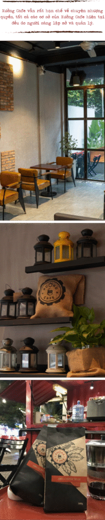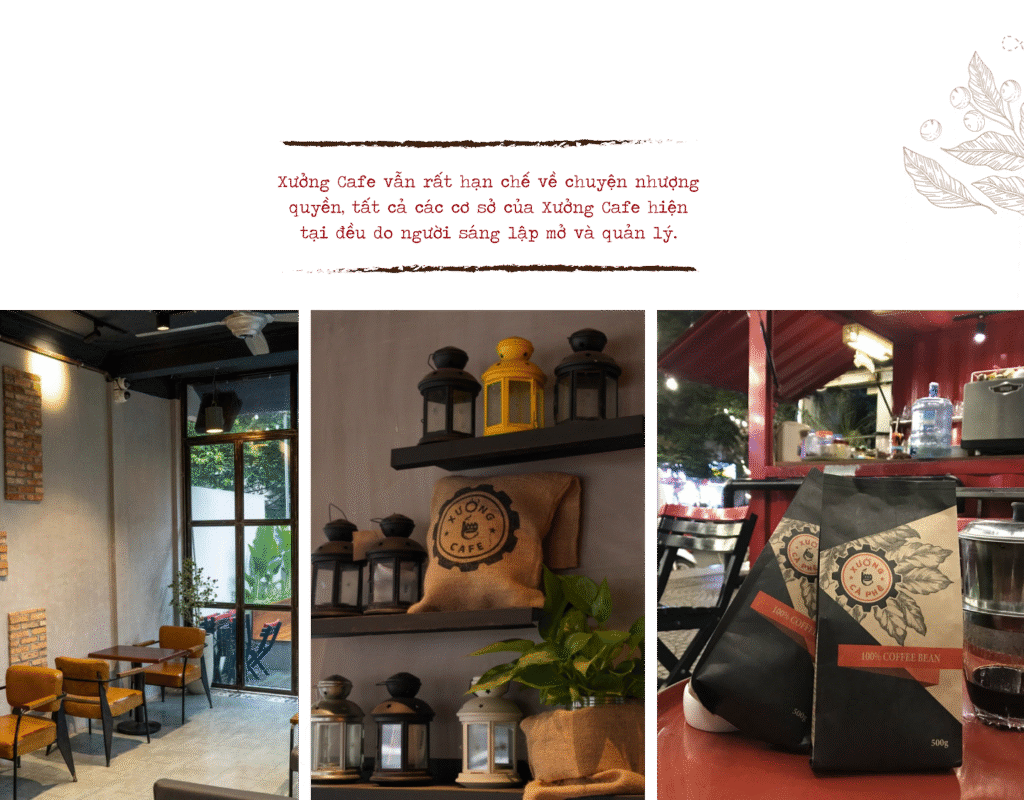 nHơn nữa, ở Việt Nam hiện tại chưa có quy định chặt chẽ cụ thể về việc nhượng quyền thương hiệu, nên cá nhân anh chị đánh giá việc này vẫn tiềm ẩn độ rủi ro rất lớn nếu chủ thương hiệu không sát sao và không có hướng xử lý kịp thời với những cơ sở nhượng quyền sai phạm. nVậy nên cho đến bây giờ Xưởng Cafe cũng vẫn rất hạn chế về chuyện nhượng quyền, tất cả các cơ sở của Xưởng Cafe đều do tự tay anh chị mở và quản lý.n