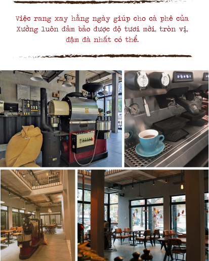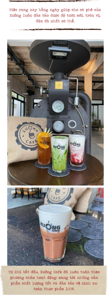 nAnh chị muốn khách hàng nhớ tới Xưởng Cafe không chỉ là một điểm đến để thưởng thức cà phê đơn thuần mà còn như một “Công Xưởng” thực thụ, có thể vừa rang, vừa xay, vừa pha chế cà phê. Ở những cơ sở đầu tiên, thậm chí anh chị còn đặt cả những chiếc máy rang, xay cà phê để khách đến quán được theo dõi quá trình từ lúc chế biến hạt đến khi ra được thành phẩm là ly cà phê tới tay khách như thế nào.n